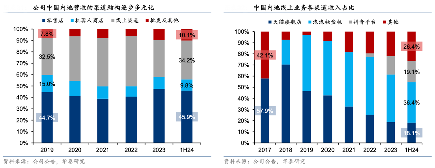 經典案例:根據公司公告、華泰研究等綜合資訊表明,截至 2024H1,泡泡瑪特公司在中國內地優質商圈已開設 374 家零售店,此外機器人商店網絡提供輕資產高效擴張渠道,為零售店提供數據洞察指引。2022下半年開始,公司把握抖音新渠道快速崛起的機遇積極布局,以自播為主的模式拓展直播營銷,目前擁有多個定位不同的直播間(例如其中抖音官方旗艦店中 MEGA 銷售占比高,泡泡家 POPHOME 聚焦家居品類,泡泡瑪特拆盒體驗館以盲盒為主)。