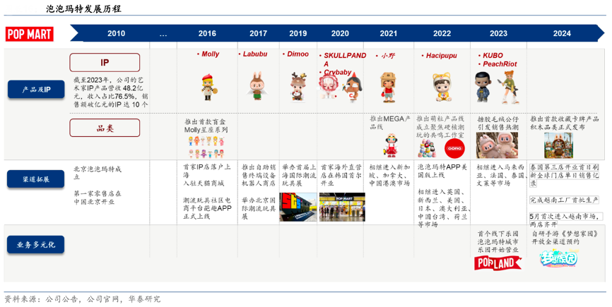 經典指標:根據公司公告、公司官網、華泰研究等綜合資訊表明,泡泡瑪特公司 2010 年成立,早期定位為文創、玩具的精品零售渠道,并在這一過程中發現了潮玩盲盒在國內的銷售潛力。2016 年公司轉型并聚焦于盲盒品類,發售首款自主潮玩盲盒系列“Molly 星座”,引領國內盲盒銷售熱潮,此后進入持續的業績釋放期。