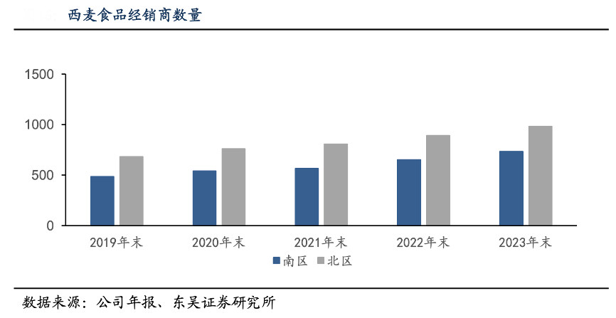 經(jīng)典案例:根據(jù)公司年報(bào)、東吳證券研究所等綜合資訊表明,截止2023年底,西麥?zhǔn)称泛献鹘?jīng)銷商達(dá)到 1718 個(gè),招商加速,已經(jīng)建立起龐大的經(jīng)銷系統(tǒng)。經(jīng)銷商網(wǎng)絡(luò)已經(jīng)覆蓋到三四線城市縣城及重點(diǎn)城市鄉(xiāng)鎮(zhèn)門店,并且根據(jù)公司戰(zhàn)略,將會(huì)針對(duì)地域開展專項(xiàng)策略,積極拓展重點(diǎn)城市在進(jìn)場(chǎng)零售業(yè)態(tài)的鋪市滲透,進(jìn)一步對(duì)優(yōu)勢(shì)區(qū)域渠道下沉。