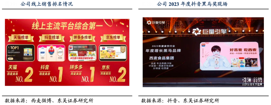 經(jīng)典案例:根據(jù)西麥微博、抖音、東吳證券研究所等綜合資訊表明,西麥已經(jīng)建立起完整的電商渠道,目前已經(jīng)覆蓋天貓、京東、拼多多等 B2C 平臺(tái),京東京喜通、阿里零售通等 B2B 平 臺(tái),抖音、快手、小紅書等興趣電商平臺(tái),與京東到家、美團(tuán)、多點(diǎn)等 O2O 大平臺(tái)展開深入合 作。2023 年,線上銷售同比增長(zhǎng) 30%,保持高速增長(zhǎng)。在抖音 GMV 超 3 億元,同比增長(zhǎng)超過(guò) 70%,同 時(shí)獲抖音平臺(tái)“黑馬獎(jiǎng)”。