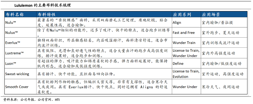 經(jīng)典案例:根據(jù)公司年報、公司官網(wǎng)、HTI.等綜合資訊表明, LULU 前期發(fā)布多種系列,產(chǎn)品系列也有優(yōu)勝劣汰,新系 列替代舊系列的機制。隨著更多運動場景和休閑場景的開發(fā),以及新技術和新材料的 應用,LULU 會持續(xù)推出或迭代更多產(chǎn)品系列。