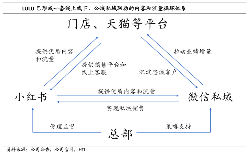 經(jīng)典案例:根據(jù)公司公告、公司官網(wǎng)、HTI.等綜合資訊表明,在進入抖音之前,LULU 已經(jīng)在形成一套線上線下、公域私域聯(lián)動的內容和流量循環(huán)體 系。 LULU 與小紅書 KOL 進行深度合作,KOL 們分享款式穿搭,跟粉絲互動并對分享 有帶動作用,LULU 粉絲們自發(fā)在小紅書上分享日常穿搭和使用體驗,這些真實內容給 LULU 提供海量素材和話題度。