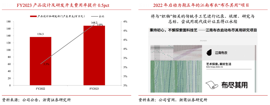 經(jīng)典案例:根據(jù)公司公告、公司官網(wǎng)、浙商證券研究所等綜合資訊表明,江南布衣通過差異化面料研發(fā)打造品牌藝術(shù)辨識度和產(chǎn)品舒適度,品質(zhì)感深入消費者心智。2022 年啟動為期五年的江南布衣“布盡其用”項目,F(xiàn)Y2023 公司產(chǎn)品設(shè)計及研發(fā)部門開支同比 +23.4%至 1.7 億元,產(chǎn)品設(shè)計及研發(fā)開支費用率同比提升 0.5pct 至 3.8%,進一步夯實從布料到生產(chǎn)的強大研發(fā)基底。