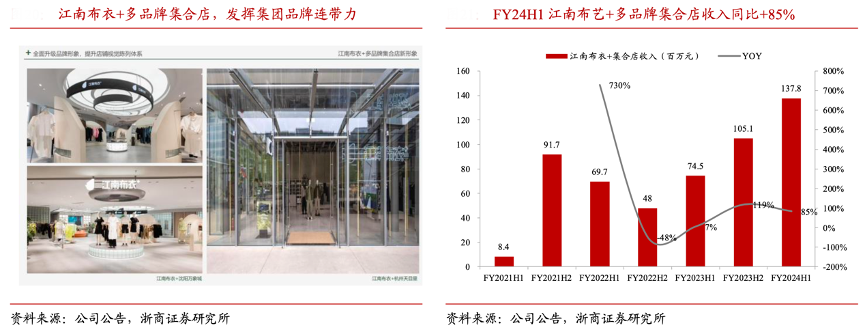 經(jīng)典案例:根據(jù)公司公告、浙商證券研究所等綜合資訊表明,江南布衣通過“不止盒子私人搭配”、“跨品牌會員權(quán)益”、“免運費寄送”、“服裝高端洗護”等會員專屬體驗的消費場景,加強粉絲粘性。FY2023H2、FY2024H1 江南布衣+集合店收入同比分別+119%、+85%至 1.05、 1.38 億元,彰顯集團品牌連帶力與新渠道的快速增長。