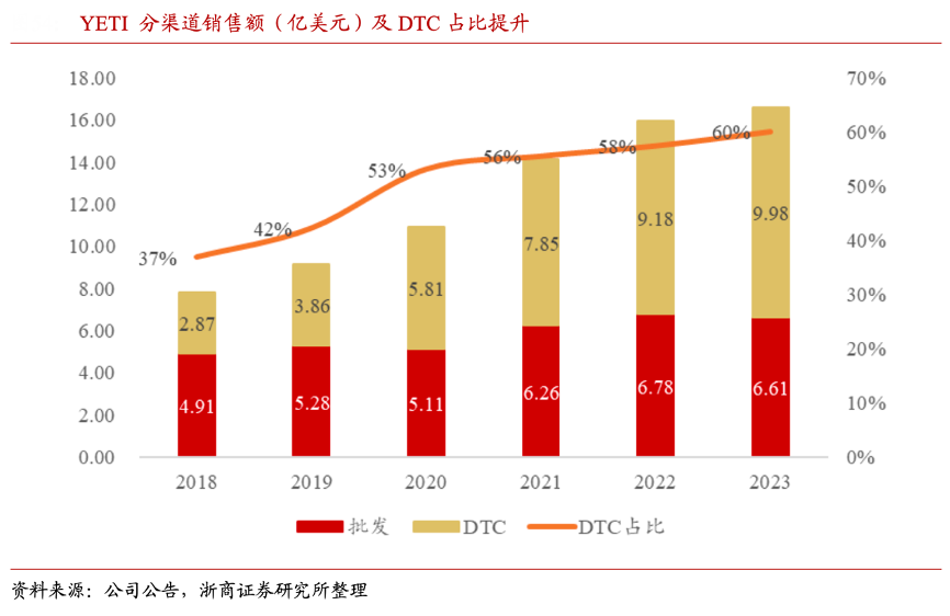 經典案例:根據公司公告、浙商證券研究所等綜合資訊表明, DTC 直銷是潮流單品常見銷售方 式,有助于消費者洞察和實現靈活快反。YETI 最早 Rambler 保溫杯于 2014 年爆火,曾因 公司批發渠道庫存積累太多戛然而止,近年積極提升 DTC 收入占比到近 60%。