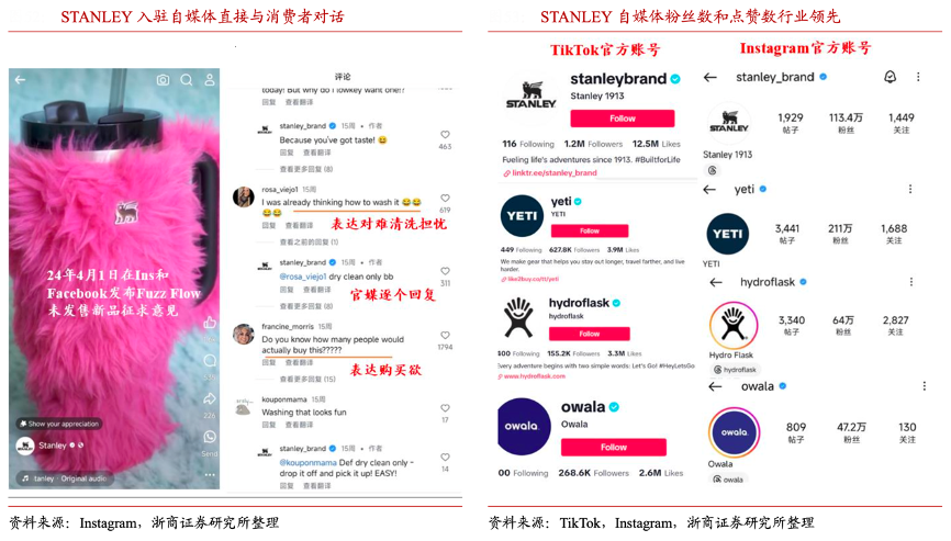 經典案例:根據Instagram、TikTOK、浙商證券研究所等綜合資訊表明,STANLEY 進駐主流官媒與消費者互動,包括售后反饋、新品測試、意見收集等, 比如 24 年 4 月 1 日,STANLEY 發布未發售新品 Fuzz Flow 視頻征求意見,收到大量網友反 饋不便清洗,該新品至今未上市。截至 24 年 7 月,STANLEY Instagram/TikTok 上粉絲數達 到 113.4 萬/120 萬。