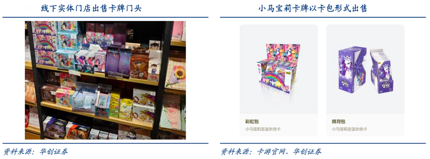 經典案例:根據卡游官網、華創證券等綜合資訊表明,在大部分集換式卡牌中,卡片通常以卡包的形式出售給消費者,消費者一般購買固定款式的卡包,每包中含有固定數量的卡片,但其中卡片的種類與內容是隨機的。因此,玩家購買卡牌時可能會抽取到相同的卡面,不同玩家之間可能對不同卡面有不同的需求,從而產生與朋友間集換卡牌的社交需求。