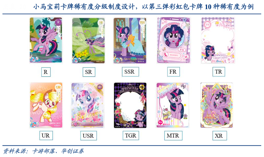 經典案例:根據卡游部落、華創證券等綜合資訊表明,以小馬寶莉卡牌·友誼永恒卡第 3 彈彩虹盒為例,有 10 種稀有度等級的卡,分別是 R、 SR、SSR、FR、TR、MTR、TGR、UR、USR 和 XR,一個彩虹盒包括 20 包,每包有五 張卡,共 100 張卡??ò梢詣澐譃橄∮邪?1XR/USR/UR/SSR+1TGR/TR/MTR+3FR/SR/R) 和普通包(1SR+1TGR/TR+3FR/R),根據卡游官方天貓店信息,在所有已生產的卡包中, 稀有包的出現概率為 10:20。不同等級的卡片抽中的概率不同,等級越高的卡牌往往抽中 的概率越低。