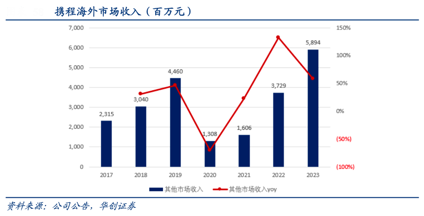 經典案例:根據公司公告、華創證券等綜合資訊表明,攜程公司以“Skyscanner+Trip.com”雙平臺發展海外業務,前者定位搜索比價平臺,增長相對穩健,2023 年占比總營收預計 7-8%;后者定位在線旅游預訂平臺,近年來實現高速增長,2023 年公 司除大中華地區的收入為 58.9 億元,同比增長 58.1%。