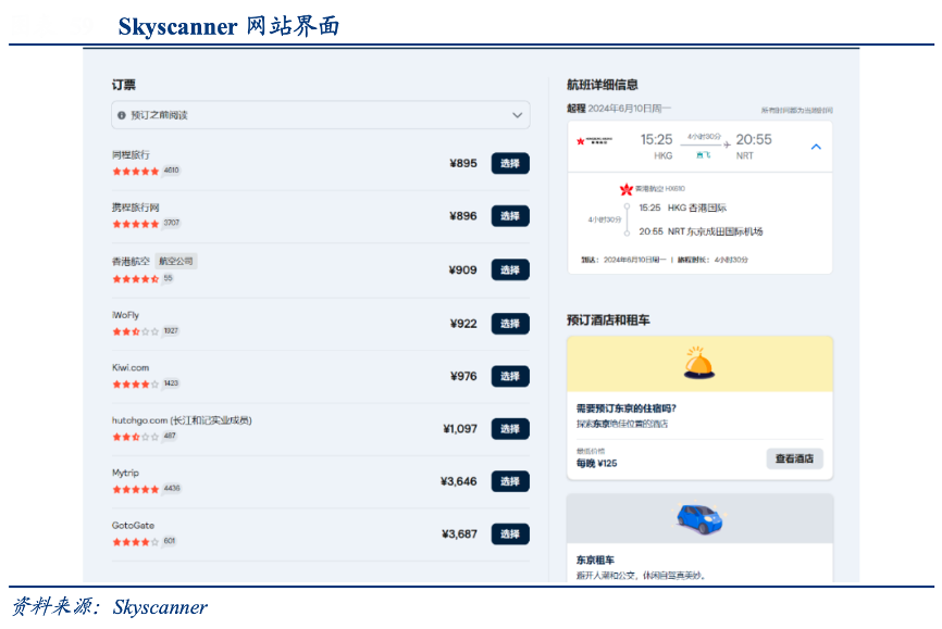 經典案例:根據Skyscanner、華創證券等綜合資訊表明,攜程Skyscanner于2003 年成立,定位機票比價平臺,2013 年和 2014 年推出租車服務和酒店 預訂,2016 年被攜程全資收購,2019 年月活用戶超 1 億,目前已是歐美主流的比價平臺 之一。
