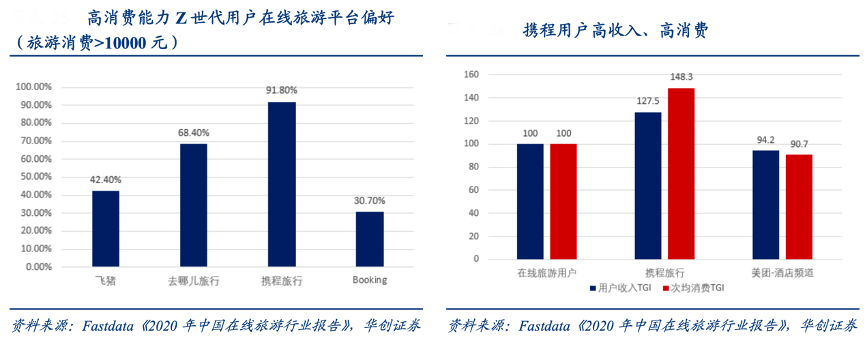 經(jīng)典案例:根據(jù)Fastdata《2020年中國在線旅游行業(yè)報告》、華創(chuàng)證券等綜合資訊表明,攜程以服務(wù)中心模式起家,2000 年收購國內(nèi)最大的電話訂房中心——現(xiàn) 代運(yùn)通, 2014 年高峰時期公司擁有 1.69 萬客服,占比公司總?cè)藬?shù)的 52.5%。據(jù)此,在前互 聯(lián)網(wǎng)時代,線下發(fā)卡、地推、高效解決的服務(wù)為攜程贏得并積累了一批優(yōu)質(zhì)商旅用戶,根據(jù) Fastdata 數(shù)據(jù),攜程用戶收入 TGI 均高于行業(yè)平均,且高消費(fèi)能力 Z 世代也更偏向 于使用攜程和去哪兒。
