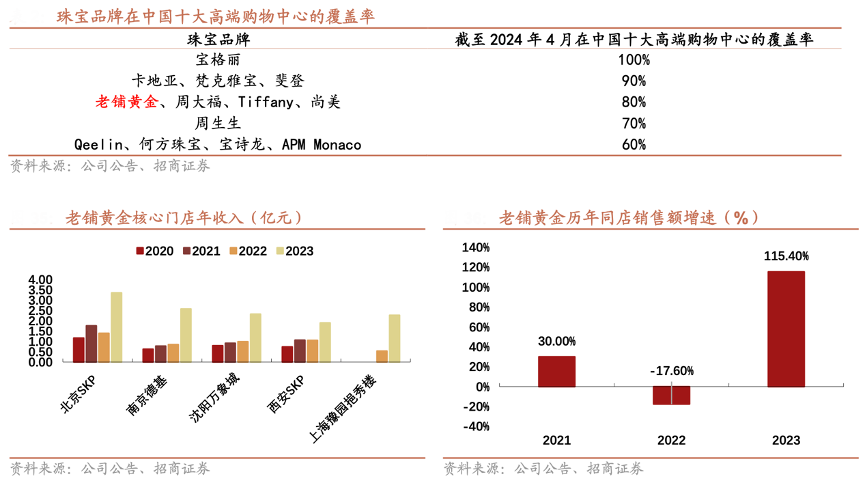 經(jīng)典案例:根據(jù)公司公告、招商證券等綜合資訊表明,從門店收入看,2023 年北京 SKP 門店年收入 3.36 億,南京德基、沈陽萬象城、上海豫園挹秀樓、西安 SKP 門店年收入分別為 2.57 億、2.33 億、2.27 億、1.90 億,單店收入規(guī)模較大。2023年其同店銷售額增長率達 115.4%。