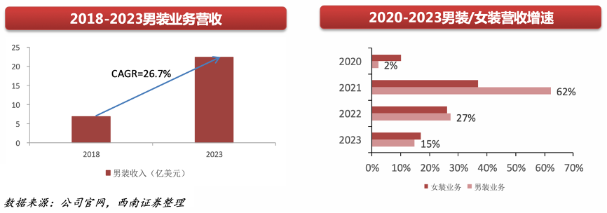 經(jīng)典案例:根據(jù)公司官網(wǎng)、西南證券等綜合資訊表明,Lululemon公司2017年推出爆 款ABC(Anti-Ball Crushing)長褲系列快速打開男 裝市場。這款褲子使用人體工程的設計,在襠部留有 足夠空間的同時利用面料的高支撐性和延展性,專門 解決傳統(tǒng)男裝褲太緊造成尷尬的問題。在2018-2023的5年時間內, 男裝業(yè)務營收增長一倍,增速遠超女裝業(yè)務。公司預 計2026年的男裝業(yè)務營收將超過40億美元。