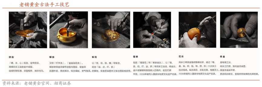 經典案例:根據老鋪黃金官網、招商證券等綜合資訊表明,老鋪黃金定位“手工古法金器”,堅持鉆研各類古法工藝,通過古法鑄型(失蠟法、手工摟胎)、手工細金(錘揲、花絲、鏨刻、鑲嵌、鏤空、炸珠、燒藍)、手工修金等工藝手法,使得產品兼具現代審美與傳統文化,自然賦予品牌歷史厚重感。