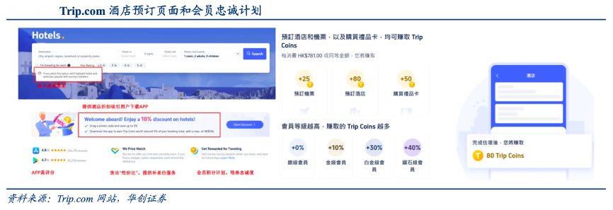 經典案例:根據Trip.com網站、華創證券等綜合資訊表明,Trip.com價格上提供最惠保障,提供積分獎勵用以加強用戶粘性。同時平臺為加強用戶粘性和讓利消費者,除享有對應會員等級的折扣外,另提供積分抵扣訂單金額計劃, 100 trip coin=1USD,會員等級越高獲取積分比例越高。