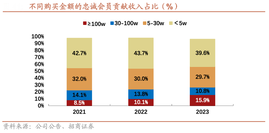經典案例:根據公司公告、招商證券等綜合資訊表明,老鋪黃金公司通過線下消費場景建設營造良好的傳統文化場景,并提供優質的客戶服務。2023 年老鋪黃金忠誠會員人數快速增長 60%,會員人數超過 20 萬。100 萬以上會員收入占比有明顯提升,從 2022 年的 10.1%提升近 6pct 至 2023 年的 15.9%,側面說明公司定位的高凈值客群對品牌的認可度持續提升。