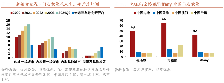 經典案例:根據公司公告、各品牌官網、招商證券等綜合資訊表明,對比國際高端珠寶品牌在中國的門店總數,根據各品牌官網數據,截至 2024 年 6 月,寶格麗、卡地亞、Tiffany 在中國內地及港澳臺地區門店總數分別為 109 家、70 家、63 家,老鋪黃金中長期較其仍有較大開店空間。