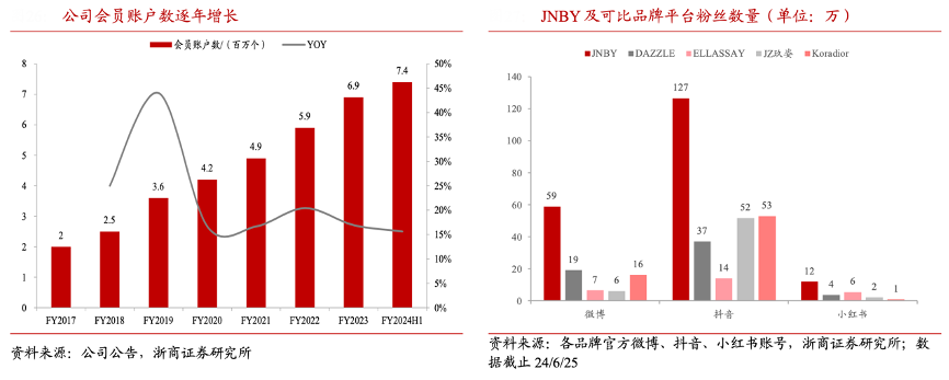 經典案例:根據公司公告、各品牌官方微博、抖音、小紅書帳號、浙商證券研究所等綜合資訊表明,江南布衣通過搭配等增值服 務、售后服務以及會員福利增強會員粘性,截至 FY2024H1 公司會員賬戶數量達 740 萬 個,FY2017-2023 年復合增速達 23%。截止 24/6/25,JNBY 品牌在新興社交平臺微博、抖 音、小紅書上粉絲數量達 59、127、12 萬人,顯著領跑其他高端女裝。