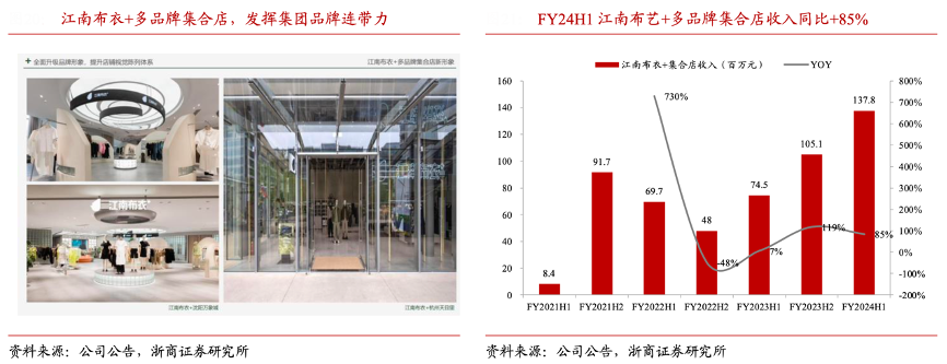 經典案例:根據公司公告、浙商證券研究所等綜合資訊表明,江南布衣通過“不止盒子私人搭配”、 “跨品牌會員權益”、“免運費寄送”、“服裝高端洗護”等會員專屬體驗的消費場景,加強粉絲粘性。FY2023H2、FY2024H1 江南布衣+集合店收入同比分別+119%、+85%至 1.05、 1.38 億元,彰顯集團品牌連帶力與新渠道的快速增長。
