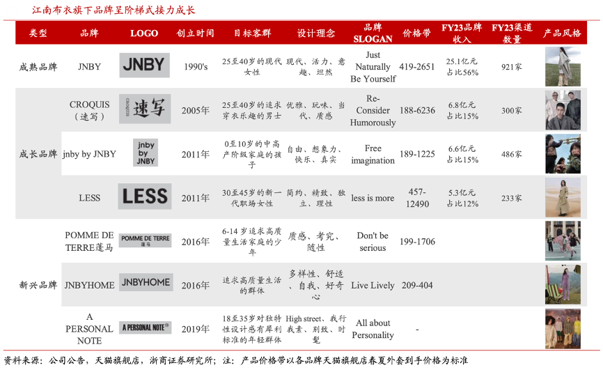 經(jīng)典案例:根據(jù)公司公告、天貓旗艦店、浙商證券研究所等綜合資訊表明,江南布衣將旗下品牌分為成熟品牌、成長(zhǎng)品牌和新興品牌,成熟品牌 JNBY 針對(duì) 25-50 歲現(xiàn)代女性,成 長(zhǎng)品牌速寫針對(duì) 25-40 歲男性、jnby by JNBY 針對(duì) 0-10 歲兒童、LESS 針對(duì) 30-45 歲職場(chǎng)女性,新興品牌蓬馬針對(duì) 6-14 歲家庭少年、JNBYHOME 是針對(duì)追求高質(zhì)量生活人群的家居服品牌、APERSONALNOTE針對(duì)18-35歲強(qiáng)調(diào)設(shè)計(jì)感的年輕群體。
