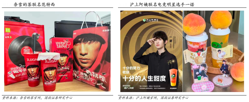 經典案例:根據奈雪的茶官網、滬上阿姨官網、國投證券研究中心等綜合資訊表明,2023年9月,在周杰倫《范特西》專輯 發行 22 周年之際,奈雪的茶聯名薄盒上線范特西音樂宇宙系列聯名產品,同時還推出了 CD 造型的杯墊、印有周杰倫專輯封面的不銹鋼杯子和手提袋,引發了一波打卡熱潮。在 2023 年亞運會開幕前夕,滬上阿姨就邀請了一諾擔任鮮果茶體驗官,消息已經發出一度刷屏了電競愛好者的社交媒體。