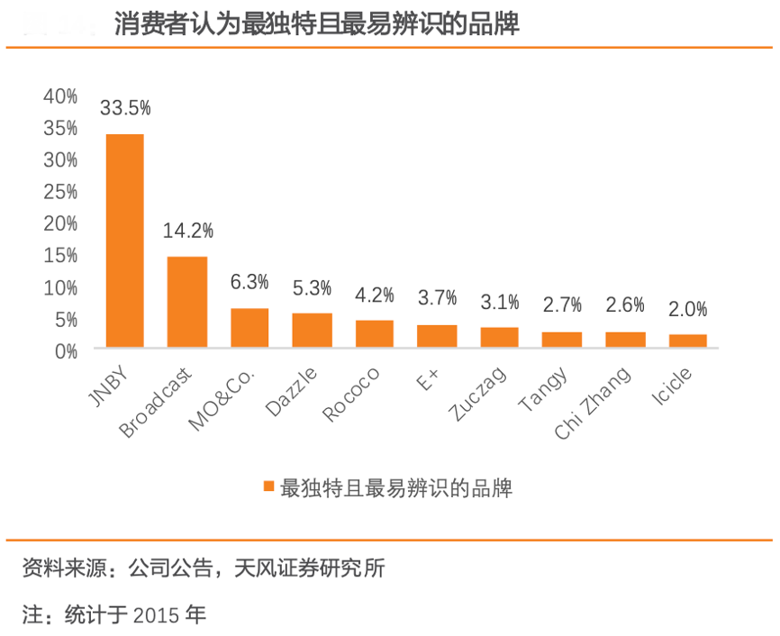 經(jīng)典案例:根據(jù)公司公告、天風(fēng)證券研究所等綜合資訊表明,結(jié)合灼識咨詢,JNBY在中國被視為最獨特且最易識別的女士服裝設(shè)計 師品牌,品 牌認(rèn) 知度排 名第一;按重復(fù) 購買客 戶數(shù)計 ,在中 國十大 女士服 裝設(shè)計 師品牌 中 享有最高 品牌忠 誠度。