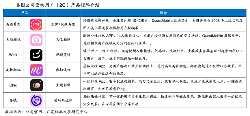 經(jīng)典案例:根據(jù)公司官網(wǎng)、廣發(fā)證券發(fā)展研究中心等綜合資訊表明,美圖公司C端產(chǎn)品主要包括美圖秀秀、美顏相機、Wink等,覆蓋拍照攝影美化、虛擬試妝、寶寶相機、視頻剪輯等多個細分場景。通過定制化“美圖配方”、AR效果、馬賽克、趣味貼紙等新穎有趣的互動模式和強大的內(nèi)容生態(tài),滿足了用戶多元化的影像處理需求。