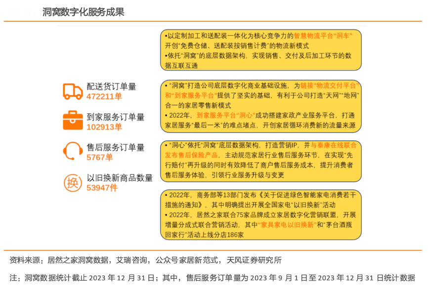 經典案例:根據公司年報、天風證券研究所等綜合資訊表明,2000年居然之家公司率先提出“先行賠付”的服務理念,后續依次推出“綠色環保”、“一個月內無理由退換貨”、“裝修 零增項 ”、“終 身維保 ”等一系列服務承諾; 2023 年圍繞“家具家電以舊換新”、“家有困難找居然”、“舊房換新顏”三大營 銷 IP,為消費者提供更多可選權益方案。