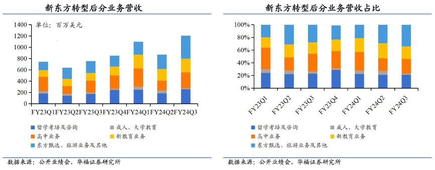 經(jīng)典案例:根據(jù)公開業(yè)績會(huì)、華福證券研究會(huì)等綜合資訊表明,新東方轉(zhuǎn)型至今新教育業(yè)務(wù)發(fā)展迅速,產(chǎn)品已獲得學(xué)生和家長的認(rèn)可,營收已由 FY23Q1 的 1.19 億美元逐步增長至 FY24Q3 的 2.41 億美元,占比自 16%提升至 20%, 有望形成持久且強(qiáng)勁的增長新引擎,同時(shí)留學(xué)、高中等傳統(tǒng)業(yè)務(wù)維持強(qiáng)勁增長。