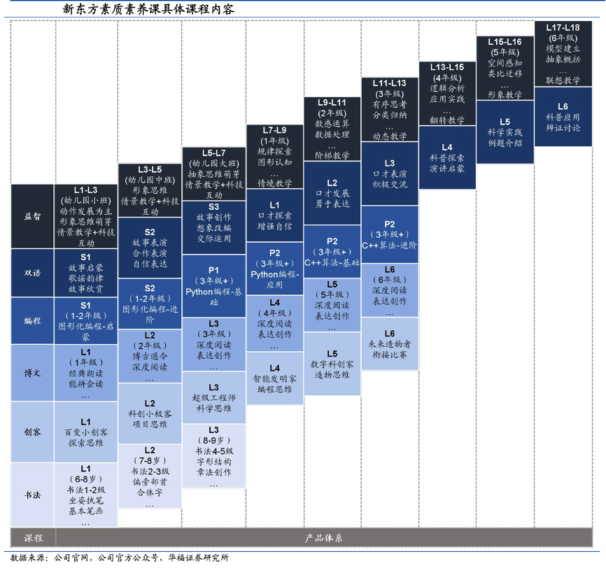 經(jīng)典案例:根據(jù)公司官網(wǎng)、公司官方公眾號(hào)、華福證券研究會(huì)等綜合資訊表明,素質(zhì)教育是新東方公司原小學(xué)學(xué)科培訓(xùn)的核心轉(zhuǎn)型方向。集團(tuán)課程產(chǎn) 品體系完善,針對不同學(xué)齡的兒童設(shè)立不同的教學(xué)內(nèi)容和方式,以適應(yīng)不同發(fā)展階 段的學(xué)習(xí)需求。例如,在益智課程中,根據(jù)學(xué)生年級不同設(shè)置了 18 個(gè)等級。對于幼 兒園小班的學(xué)生,采用情景教學(xué)和科技互動(dòng)的方式培養(yǎng)孩子的形象思維。