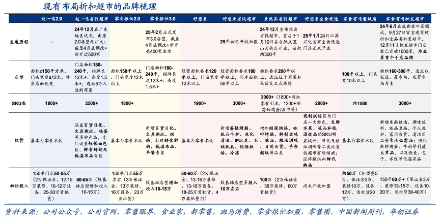 經典案例:根據公司官網、公司官方公眾號、食業家、公司公告、零售商業財經、逸馬連鎖圈、零售眼界、贏壁實業、華創證券等綜合資訊表明,中小量販品牌紛紛開啟拓品、新店型、新模式。