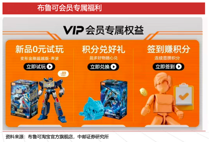 經典案例:根據布魯可淘寶官方旗艦店、中郵證券研究所等綜合資訊表明,布魯可公司在各電商旗艦店針對不同會員等級提供福利,截至2024H1,公司各電商旗艦店擁有超過 880 萬名粉絲。