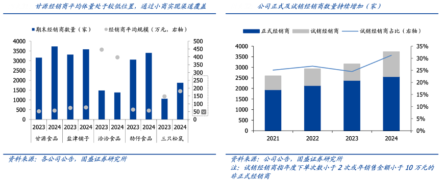 經(jīng)典案例:根據(jù)各公司公告、國盛證券研究所等綜合資訊表明,甘源橫向?qū)Ρ瓤矗试唇?jīng)銷商數(shù)量處于行業(yè)相對(duì)高位, 但經(jīng)銷商平均體量處于較低水位,預(yù)計(jì)與甘源過去大單品集中度較高,以及渠道覆蓋度 寬幅密切相關(guān)。從渠道維度看,公司更加精耕運(yùn)營,招募代言人提升品牌聲量,且持續(xù)招 募新經(jīng)銷商,正式經(jīng)銷商及試銷經(jīng)銷商數(shù)量持續(xù)提升,側(cè)面印證市場覆蓋度逐步增加, 對(duì)潛力區(qū)域及空白市場的下沉更進(jìn)一步。