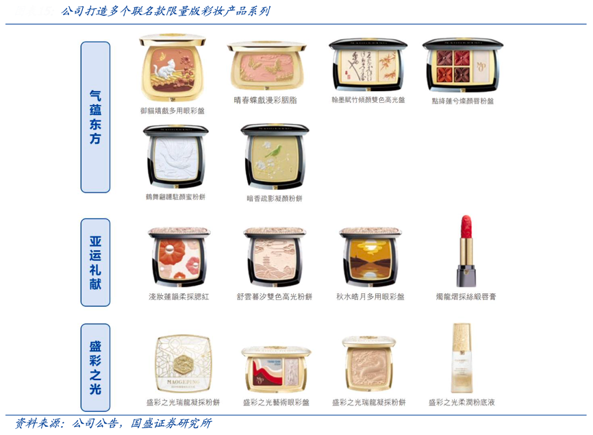 經(jīng)典案例:根據(jù)公司公告、國(guó)盛證券研究所等綜合資訊表明,MGP 品牌在彩妝條線推 出限量版產(chǎn)品,融入傳統(tǒng)文化及先進(jìn)技術(shù)以提升使用體驗(yàn)和妝效,推出的代表性限量版 產(chǎn)品包括氣蘊(yùn)東方系列(與故宮文創(chuàng)聯(lián)手打造,融合故宮博物館的百年傳承和傳統(tǒng)東方 美學(xué)元素,目前已升級(jí)至第五代)、亞運(yùn)禮獻(xiàn)系列(結(jié)合杭州美景和亞運(yùn)元素)等。