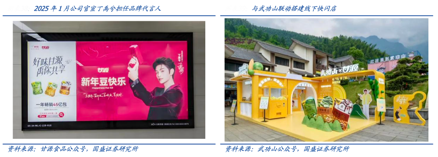 經典案例:根據甘源食品公眾號、武功山公眾號、國盛證券研究所等綜合資訊表明,2025年1月甘源公司官宣丁禹兮擔任品牌代言人,春節期間定制代言人禮盒,搭配贈送明星獨家周邊。同時開展一系列品宣活動,線下聯合老婆 大人打造定制陳列,組織主題門店打卡活動。此外借助萍鄉旅游優勢,與武功山聯名搭建線下快閃店,打卡贈送冰激凌,并沿線投放宣傳物料,實現吃喝玩樂巧妙互動。