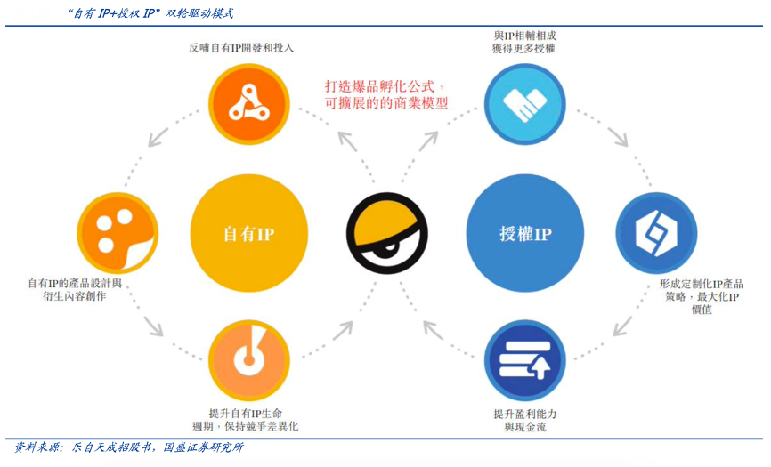 經典案例:根據樂自天成招股書、國盛證券研究所等綜合資訊表明,樂自天成公司以“自有 IP+授權 IP”雙輪驅動模式,構建全年齡段、全場景 IP 矩陣。公司業務主要為產品銷售,其包括三個部分,分別為自有 IP、授權 IP 和外 部采購。2024 年公司總收入為 6.3 億元,同比增長 30.65%,其中,自有 IP/授權 IP/外 部采購/其他服務分別占比 24.5%/64.5%/10.8%/0.2%。