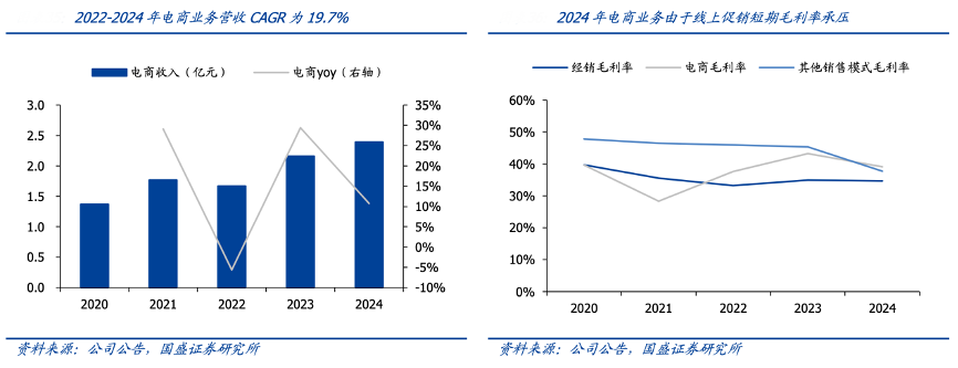 經典案例:根據公司公告、國盛證券研究所等綜合資訊表明,甘源食品公司 2014 年上線天貓旗艦店,此后陸續登陸京東、拼多多等傳統電商以及抖音、快手等直播電商。伴隨直播電商快速發展、形成對傳統電商份額的搶占,甘源加大對達播、自播、短視頻的推廣力度。2024 年 甘源電商業務實現營收 2.4 億元,同比+10.7%。