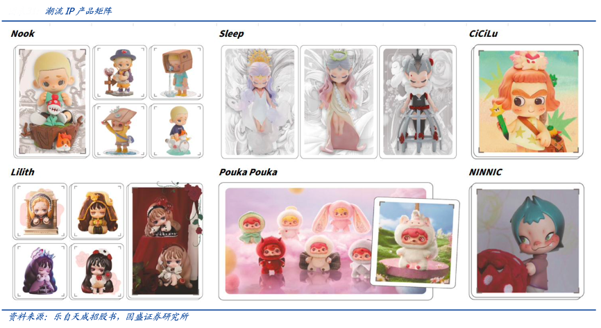 經(jīng)典案例:根據(jù)樂自天成招股書、國盛證券研究所等綜合資訊表明,樂自天成的潮流IP主要面向年輕一代的流行文化愛好者;除自主開發(fā)的Nook、Sleep、Lilith 等 IP 外,公司還通過收購獲得了外部藝術(shù)家開發(fā)的 CiCilu、NINNIC 和 Pouka Pouka 等潮流 IP 的版權(quán)。