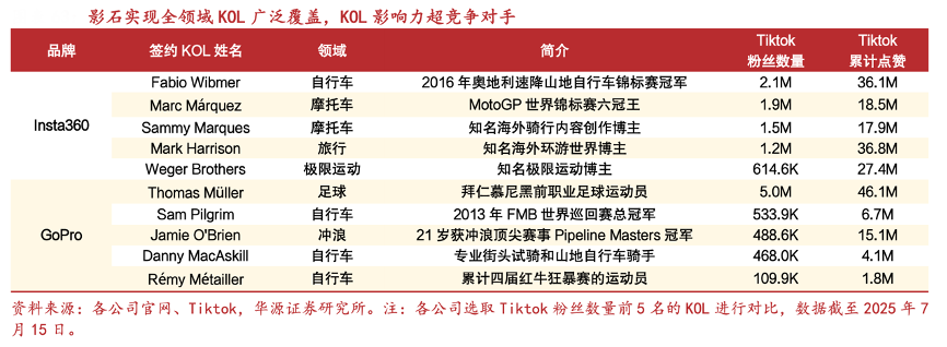 經典案例:根據各公司官網、Tiktok、華源證券研究所等綜合資訊表明,影石實現全領域 KOL 廣泛覆蓋,KOL影響力超競爭對手。