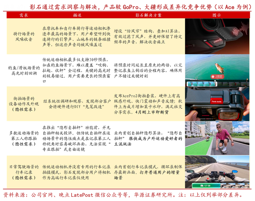 經典案例:根據公司官網、晚點LatePost微信公眾號等、華源證券研究所等綜合資訊表明,復盤影石產品發展歷程,公司創新的推出了一系列實用功能,滿足了全景/運動相機不同場景的細分需求。如:1)騎行“防風簾”:為了保留快速騎行的引擎聲,同時消除風噪,公司開發了騎行防風簾結構,并疊加 AI 算法,可有效過濾風聲。