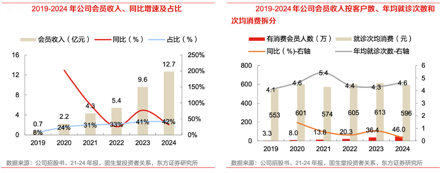 經典案例:根據公司招股書、21-24年報、固生堂投資者關系、東方證券研究所等綜合資訊表明,固生堂以會員體系開拓高頻服務的增量客戶。公司于 2019 年 3 月推出會員制度,提供專有服務、貴細 藥材和咨詢費折扣價和綠色就診通道,會員數量和收入同步快速擴大。2019-2024 年會員收入和 有消費會員數量 CAGR 分別達到 76.8%和 69.8%。