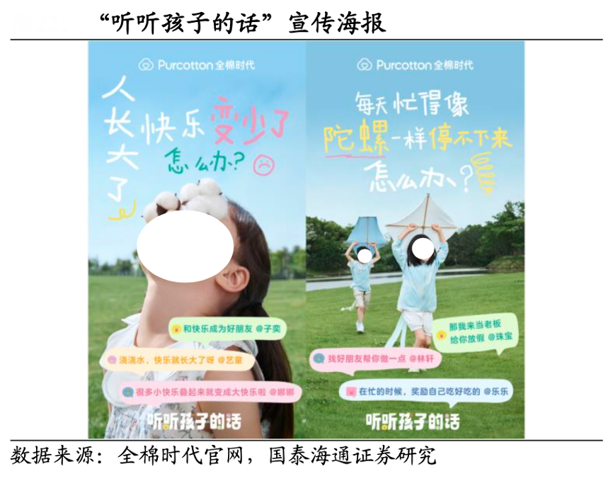 經(jīng)典案例:根據(jù)全棉時(shí)代官網(wǎng)、國(guó)泰海通證券研究等綜合資訊表明,全棉時(shí)代公司在兒童節(jié)來(lái)臨之際,會(huì)策劃“聽(tīng)聽(tīng)孩子的話”主題征集及地鐵創(chuàng)意展覽、聽(tīng)聽(tīng)孩子的話主題片、線下童裝秀 等,傳遞出傾聽(tīng)孩子、更懂孩子的品牌形象,搭建大人與孩子奔赴的橋梁。