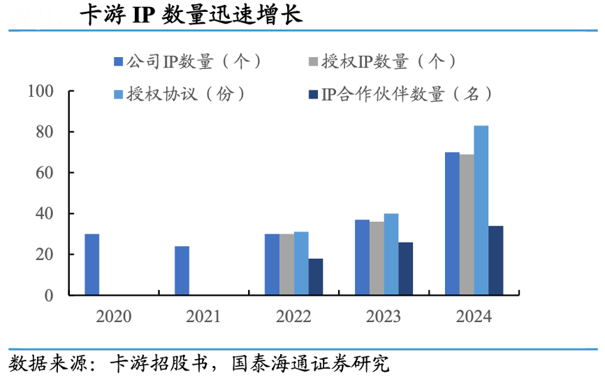經(jīng)典案例:根據(jù)卡游招股書、國(guó)泰海通證券研究等綜合資訊表明,為吸引廣大消費(fèi)者,卡游公司通過(guò)來(lái)自 IP 合作伙 伴的授權(quán)和開發(fā)自有 IP 不斷擴(kuò)充 IP 矩陣,IP 數(shù)量由截至 2022 年 12 月 31 日的 30 個(gè)增加至截至 2023 年 12 月 31 日的 37 個(gè),其后增加至截至 2024 年 12 月 31 日的 70 個(gè)。