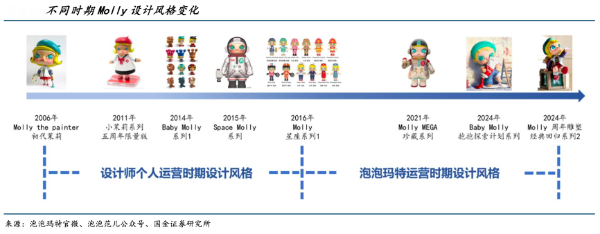 經典案例:根據泡泡瑪特官微、泡泡范兒公眾號、國金證券研究所等綜合資訊表明,在泡泡瑪特接管運營后,Molly的設計風格經歷了漸進式調整,頭身比例更加協調,面部輪廓線條趨于柔和化處理,整體造型風格向甜美化、高親和力的方向演變。Molly 憑借差異化的形象迅速占領年輕消費者心智。其設計兼具“萌系”與“藝術感”,精準契合 Z 世代對個性化和情感價值的追求。