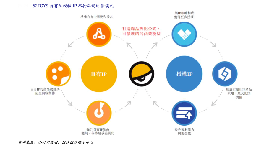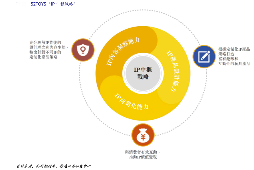 經(jīng)典案例:根據(jù)公司招股書、信達證券研發(fā)中心等綜合資訊表明,52TOYS 開創(chuàng)獨 特的“IP 中樞”戰(zhàn)略,通過定制化 IP 產(chǎn)品構(gòu)建多元化產(chǎn)品矩陣,形成循環(huán),拓展 IP 內(nèi)容生態(tài),豐富 IP 價值并延長 IP 生命周期。