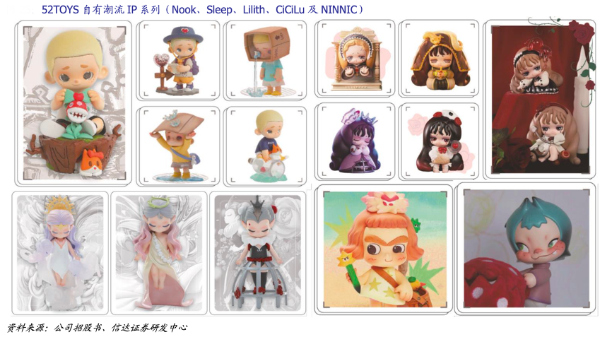 經(jīng)典案例:根據(jù)公司招股書、信達(dá)證券研發(fā)中心等綜合資訊表明,52TOYS自有 IP:主要包括1潮流 IP,如 Nook、Sleep、Lilith、CiCiLu 及 NINNIC, 由公司進(jìn)行打造,視覺(jué)效果獨(dú)特,個(gè)性鮮明。